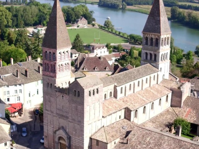 De Saint-Philibert abdij, op de rechteroever van de Saône, staat in het hart van Tournus en wordt omringd door een oude vesting waarvan diverse delen overeind zijn gebleven. Vlak voor de ingang van de abdij staan nog twee stevige toegangstorens.