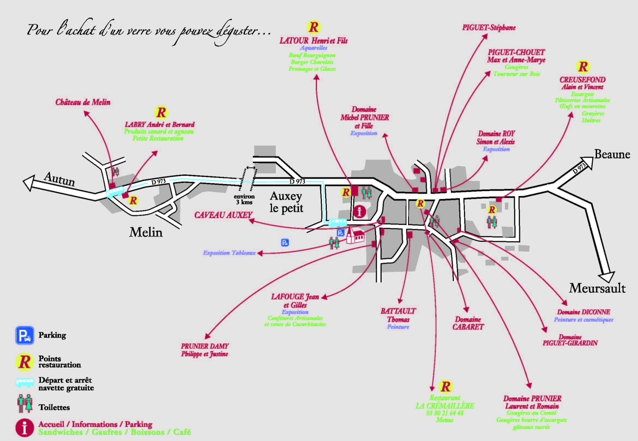 De ontvangst is op het plein voor de kerk van Auxey-Duressess. Er rijdt een gratis shuttle op en neer naar Melin. Ter plaatse zijn hapjes te koop. Verder wordt er gedemonstreerd hoe wijnvaten te maken.