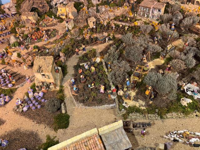 Typisch voor een Provençaalse kerststal zijn de santons (kleine heiligen), de handgeschilderde beeldjes uit die streek. Arlette Bertello uit Arles en Philippe Albertini uit Bastia werkten twee weken aan de inrichting van de stal in de Bourgondische abdij. Arlette verzamelde in ruim 50 jaar meer dan 3.000 handgemaakte santons. De meeste exemplaren zijn uniek. Philippe is gespecialiseerd in het vervaardigen van de gebouwen: molens, schaapskooien, winkels, boerderijen en hutten.