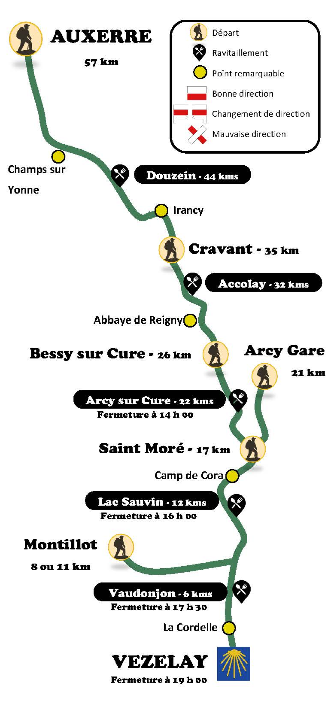 De volledige route is 57 kilometer, maar het is ook mogelijk om onderweg aan te haken. Vanuit Vézelay worden bussen ingezet om de deelnemers terug te brengen naar de plaats waar ze zijn vertrokken.