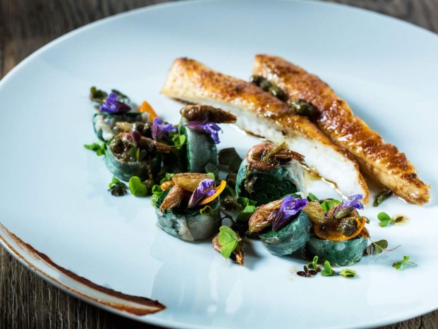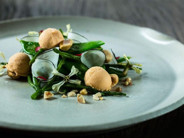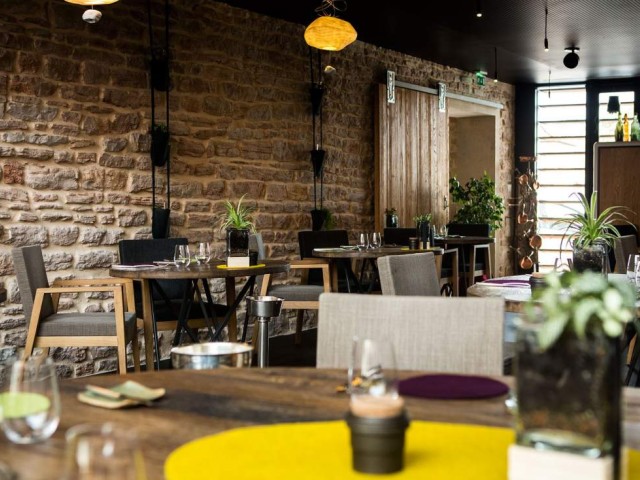 Voor de gedurfde en duurzame gerechten van Jean-Michel, creëerde Amandine een eetzaal met een elegante, sobere en rustige uitstraling. Ze gebruikte vooral hout, stenen en metalen; nobele, ruwe materialen die harmonieus met elkaar samengaan. Amandine Carrette wilde hiermee dicht bij de natuur blijven en teruggaan naar de essentie.