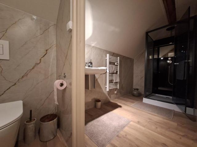 De sfeervolle en moderne badkamer beschikt over een douchecabine met regendouche en handdouche. Bij de wastafel is een stopcontact en er hangt een handdoekenverwarming. Zelfs de föhn ontbreekt niet. Het separate toilet is extra hygiënisch doordat er geen rand aan zit.