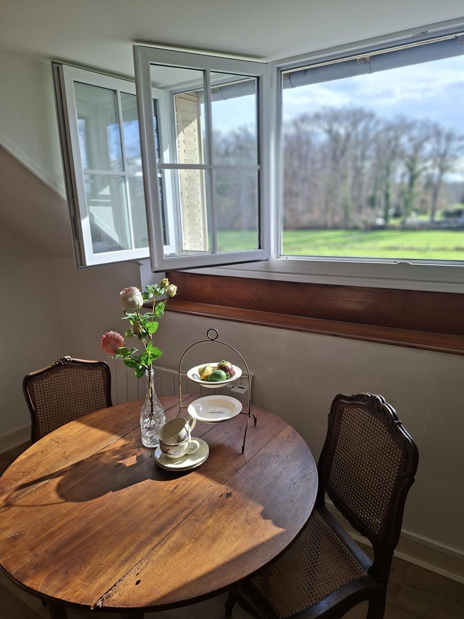 Over de gehele lengte van de salon en slaapkamer zijn openslaande ramen om het buitengevoel binnen te halen. U heeft een magnifiek uitzicht over het weiland en bos.