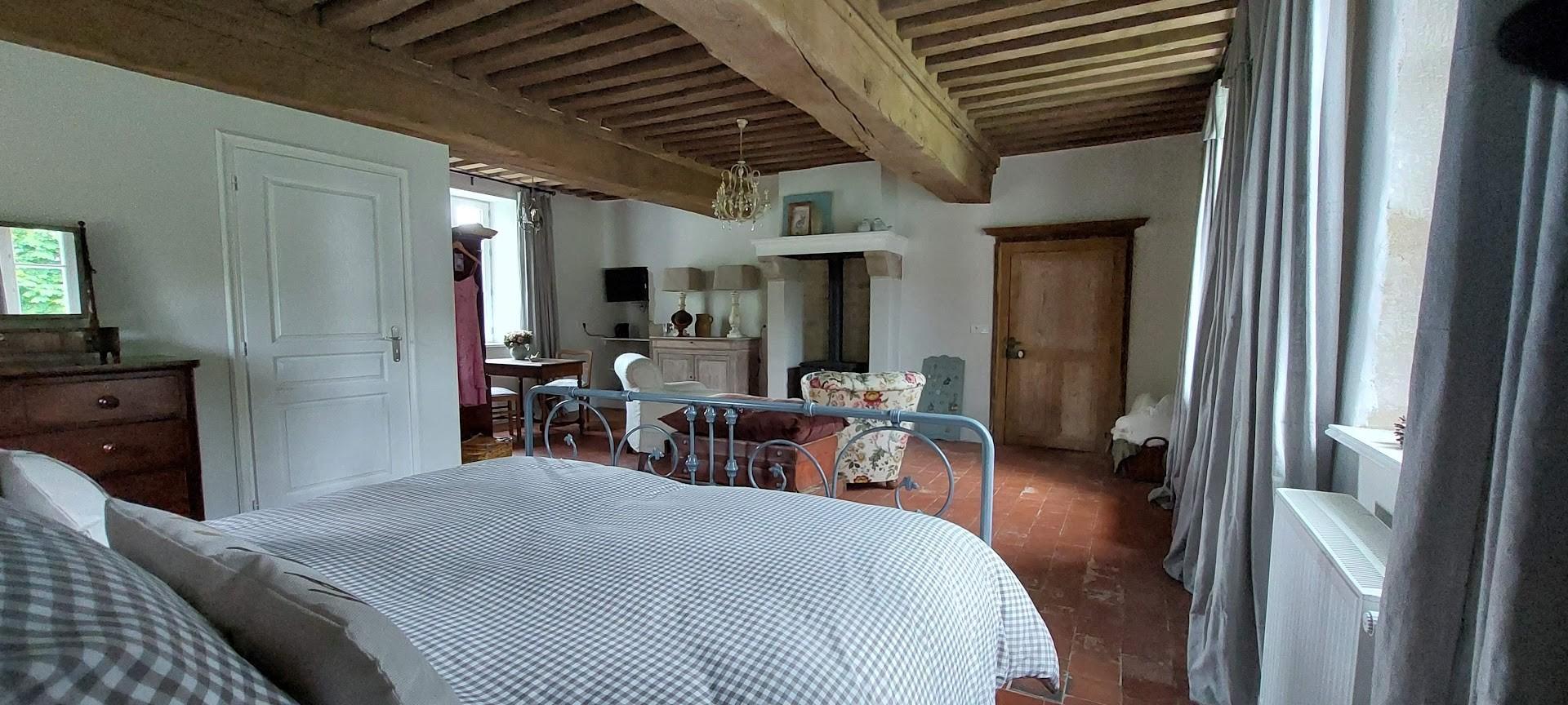 Onze ruime Chambre d’hôtes (50 m²) beschikt over een luxe en suite badkamer met inloopdouche, vloerverwarming en panoramisch uitzicht. De kamer is uitgerust met een kingsize bed, koffiecorner met L’Or espresso, waterkoker, smart TV en gratis wifi. Ontbijt met vers brood en eitjes van onze eigen kippen is inbegrepen.