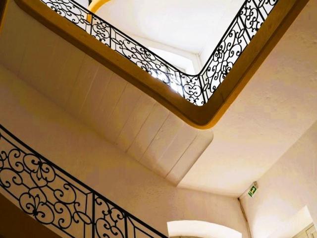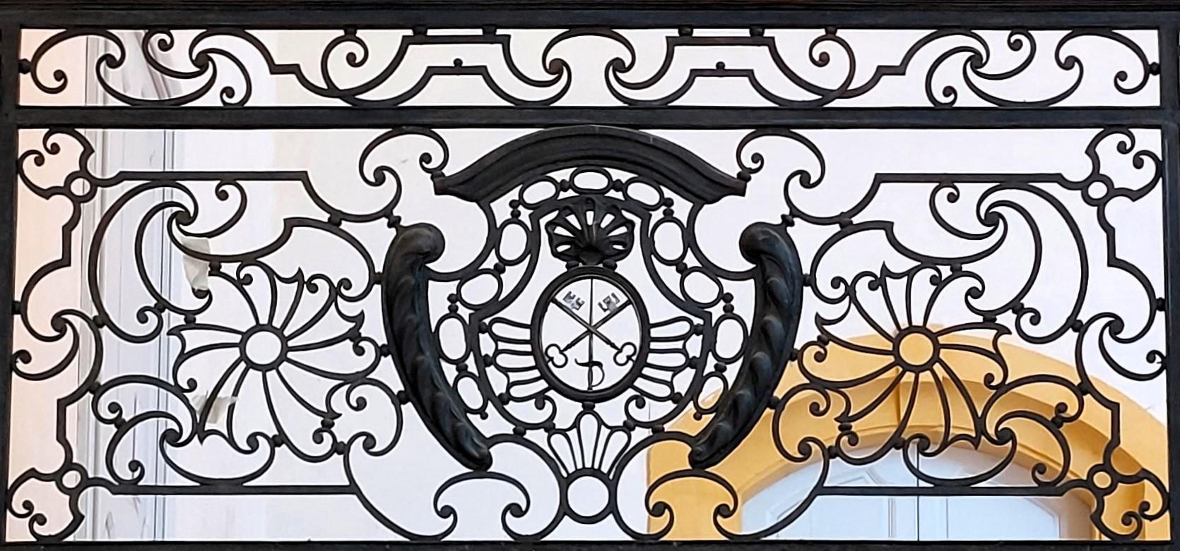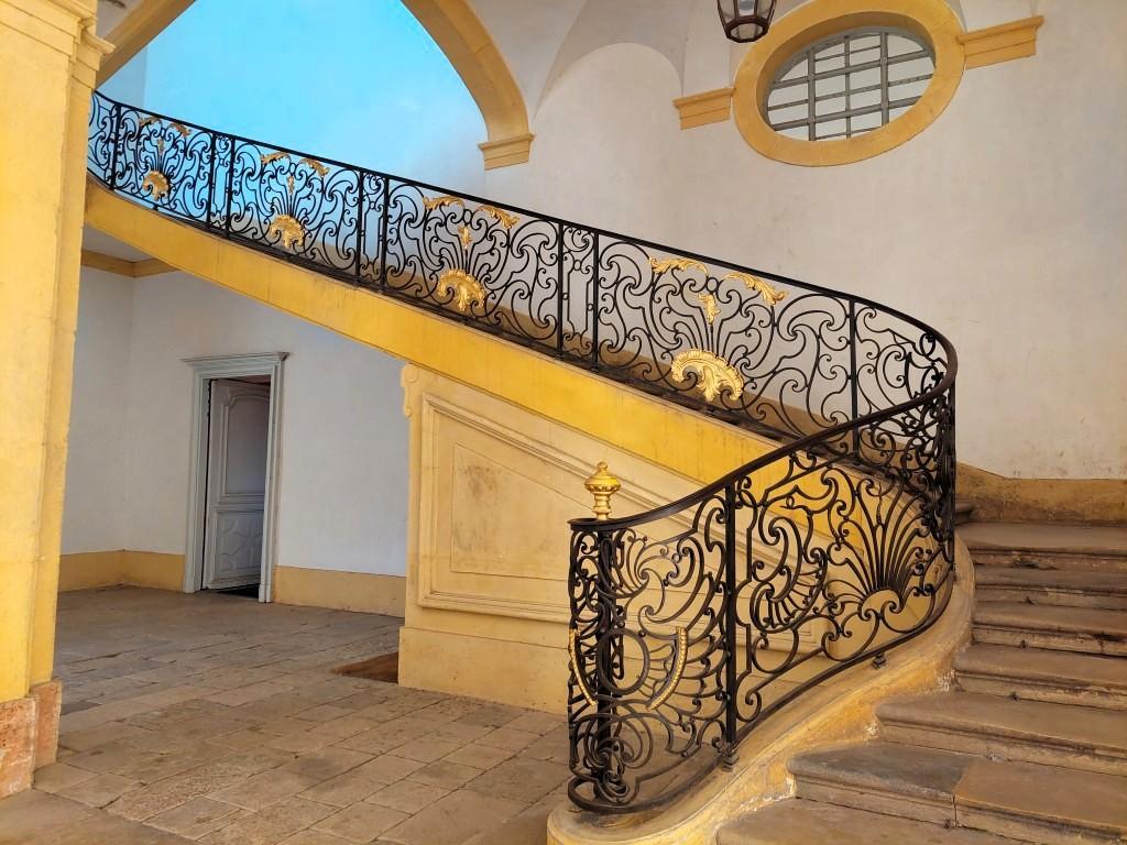 Zijn beroemdste en meest indrukwekkende creatie ligt echter in de abdij: de monumentale trapleuning, die hij in 1750 maakt. De trap is opgezet rond een open patio en voert naar de bovenverdieping waar vroeger de monnikencellen lagen. Het elegante en rijke smeedwerk maakt dit geheel tot een van de mooiste voorbeelden van achttiende-eeuwse siersmeedkunst in de regio. Ook het grote balkon aan de gevel van het hoofdgebouw, eveneens uit 1750, geldt als een meesterwerk.