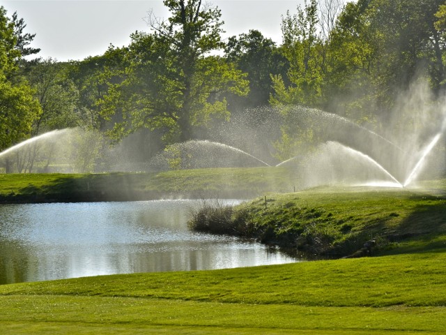 Van de 18 holes liggen er 11 in het bos en 7 op het plateau. Meest bekend is hole 5, bij het meer, dat een prachtig uitzicht biedt op het kasteel en de boerderij.