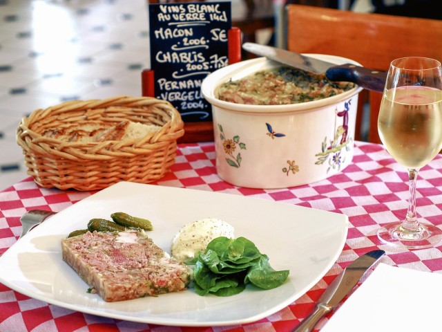 - De ham met een kalfspoot (voor de gelei), twee sjalotjes, laurierblad, tijm, dragon, kervel in een pot au feu klaarmaken en daarbij begieten met Bourgondische aligoté wijn. Ongeveer twee uur koken op een zacht vuur.