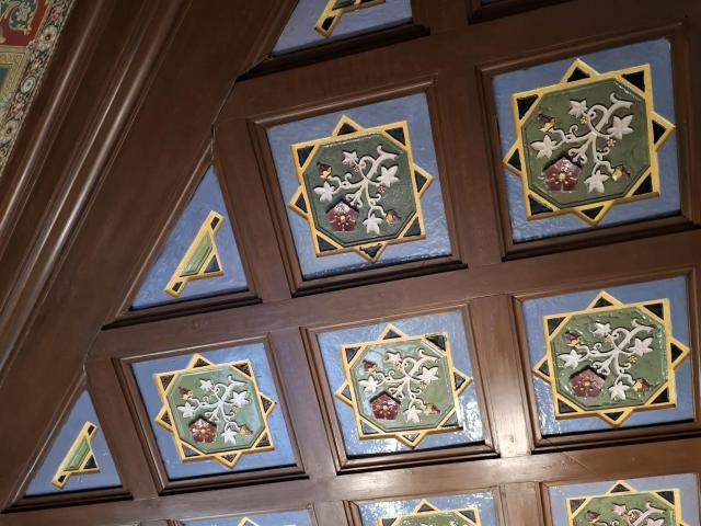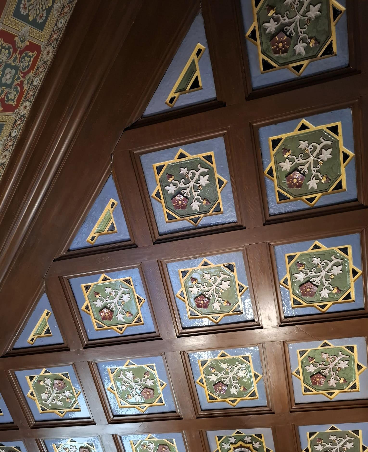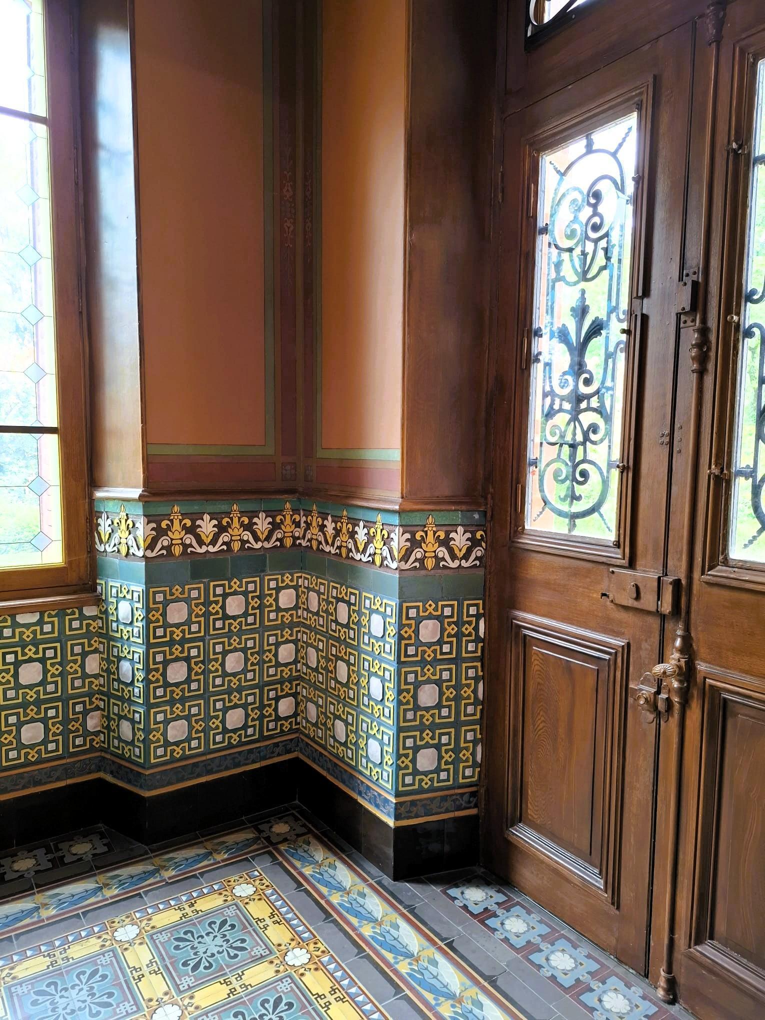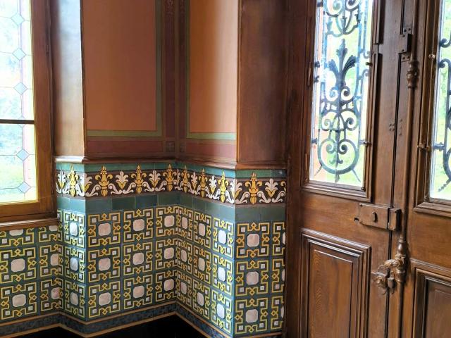 De interieurs zijn versierd met keramische ornamenten: vloertegels, lambrisering, plafonds, haarden, panelen en friezen tonen de technische en artistieke kunde van de fabriek. In de ontvangsthal zijn de wanden van vloer tot plafond betegeld. De monumentale trap is een pronkstuk, naast de trap ligt het kantoor waar transacties plaatsvonden. Het behang is een zorgvuldig gereconstrueerde kopie van het origineel.