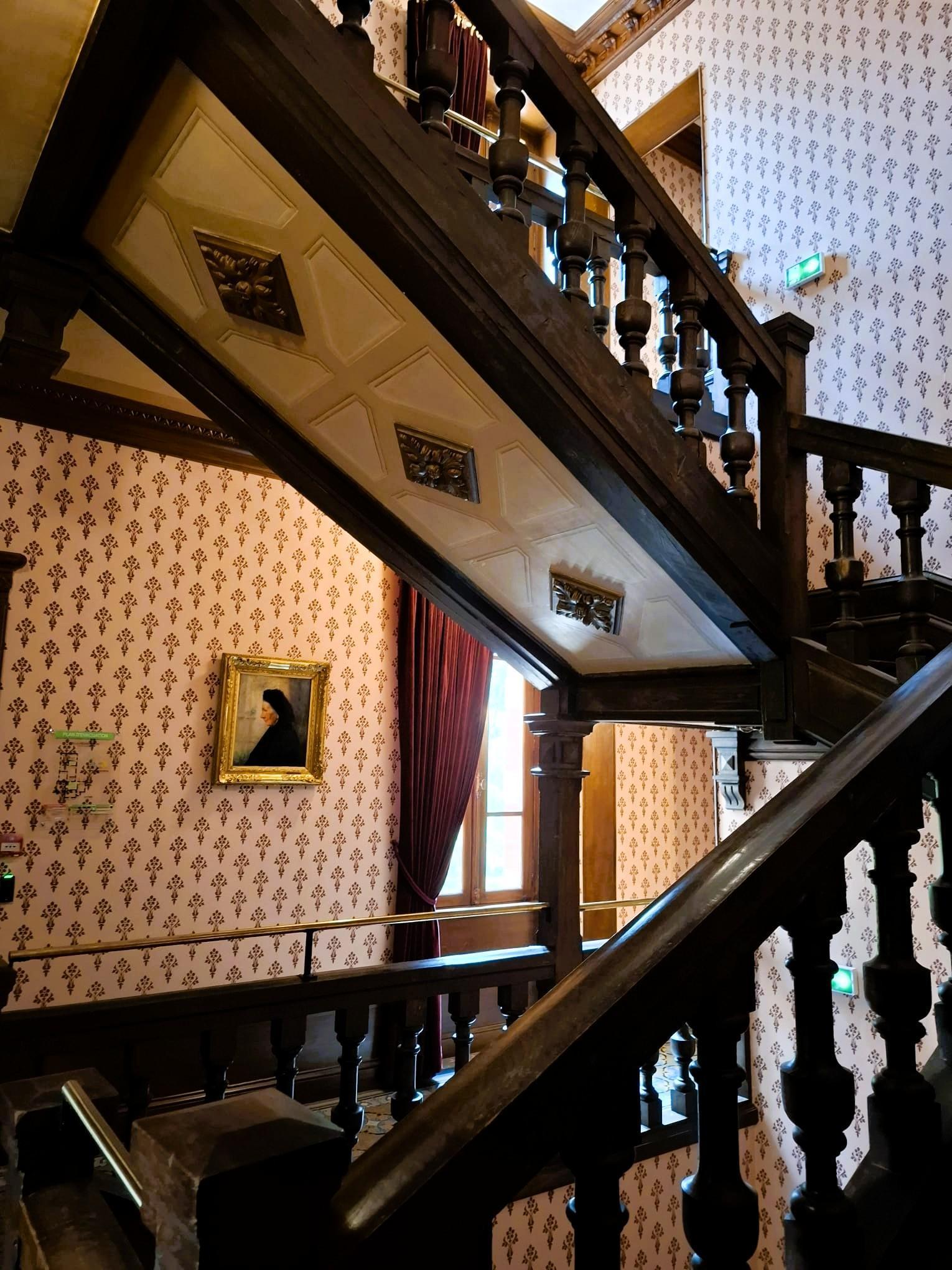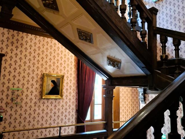 Op de eerste etage ligt de salon in Belle Époque-stijl, met een piano als statussymbool. Verder zijn er de slaapkamer van de vrouw, compleet met kap- en werktafel, een kleine maar functionele badkamer met twee kantelbare wasbakken en een soberder herenkamer met hoekbed en schrijftafel.