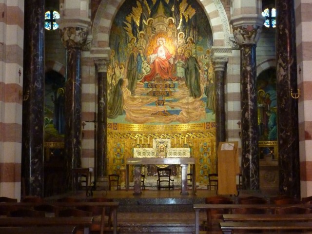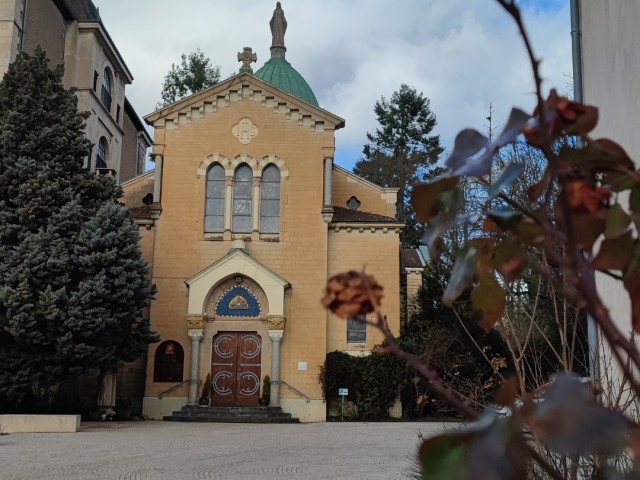 Deze Jezuïetenkapel in Paray-le-Monial is geïnspireerd op de Byzantijnse stijl. Aan de buitenkant is het een eenvoudig gebouw. De binnenkant is echter rijk gedecoreerd met beelden, mozaïeken en glas-in-lood-vensters. De kapitelen zijn gebeeldhouwd en beschilderd.