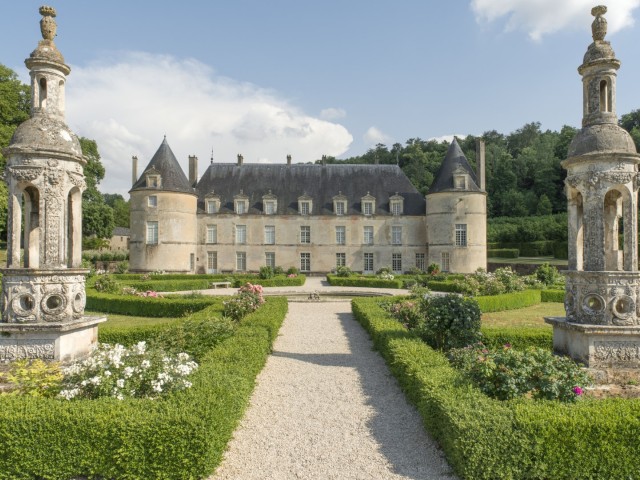 Waterpartijen, groene vakken, een labyrint en bosschages worden afgebakend door lanen in een stervorm. Het terras is gedecoreerd met randen van buxus, een variëteit van oude rozen en uitbundige pioenrozen. Beelden van mythologische figuren verfraaien het geheel. In het park bevinden zich ook een bijenschans, ijskelders, een wasplaats, een duiventil, een boomgaard en een groentetuin waarin oude groenterassen worden geteeld.