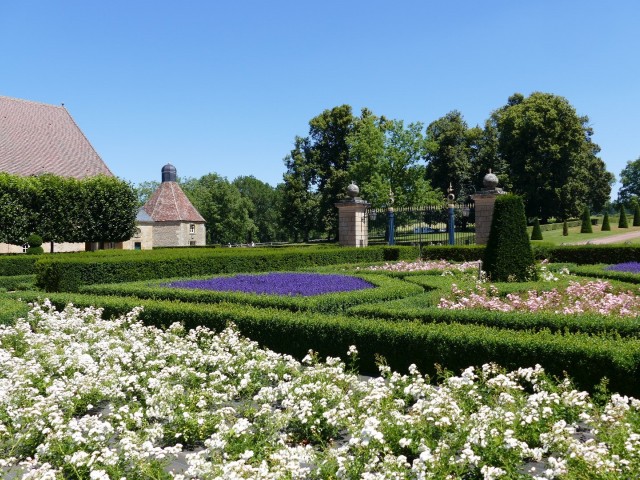 Waar vroeger de moestuin lag is nu een ellipsvormige rozentuin gemaakt met zo’n 1.300 rozenstruiken van 20 verschillende soorten. Het ruikt er heerlijk.