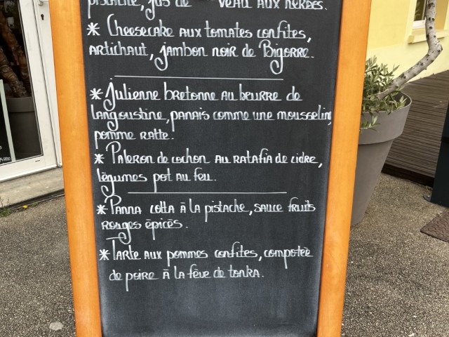 Het menu verandert er vrijwel met de dag. De chef kookt waar hij op dat moment zin in heeft en gebruikt vooral seizoensproducten uit de eigen regio. Daarnaast heeft hij meestal ook enkele eigen gerechten met Franse klassiekers, zoals slakken of kalfszwezerik, op de kaart staan. Zijn wijnkelder is zeer uitgebreid.
