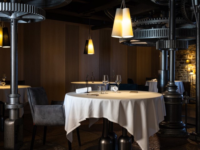 De oude mechaniek van de molen is nog zichtbaar in de eetzaal. De gebruikte materialen, hout en steen, geven het restaurant een warme ziel. In een glazen serre, met uitzicht op de rivier, is nog een tweede eetzaal.