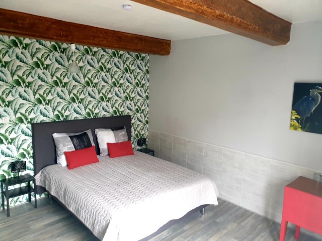 De tuinkamer is geschikt voor 2 personen en ligt aan de zijde van de tuin met zwembad. Hij heeft een eigen badkamer met hangtoilet, grote marmeren wasbak en inloopdouche. Aanwezig zijn: een groot 2-persoons boxspring bed, smart tv, koffie- en theefaciliteiten en een privéterrasje.
