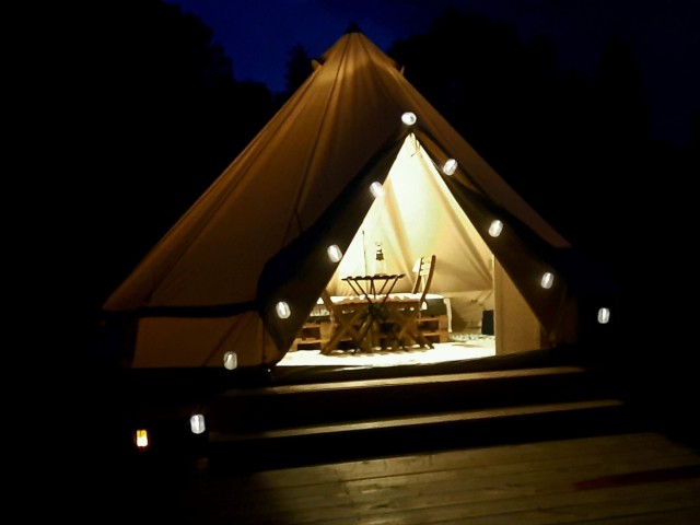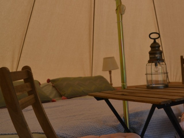 Wij verhuren een geheel ingerichte Bell tent met privé sanitair. De tent is geschikt voor 2 personen , en er is ook nog ruimte om een kinderbedje of logeerbed bij te zetten.