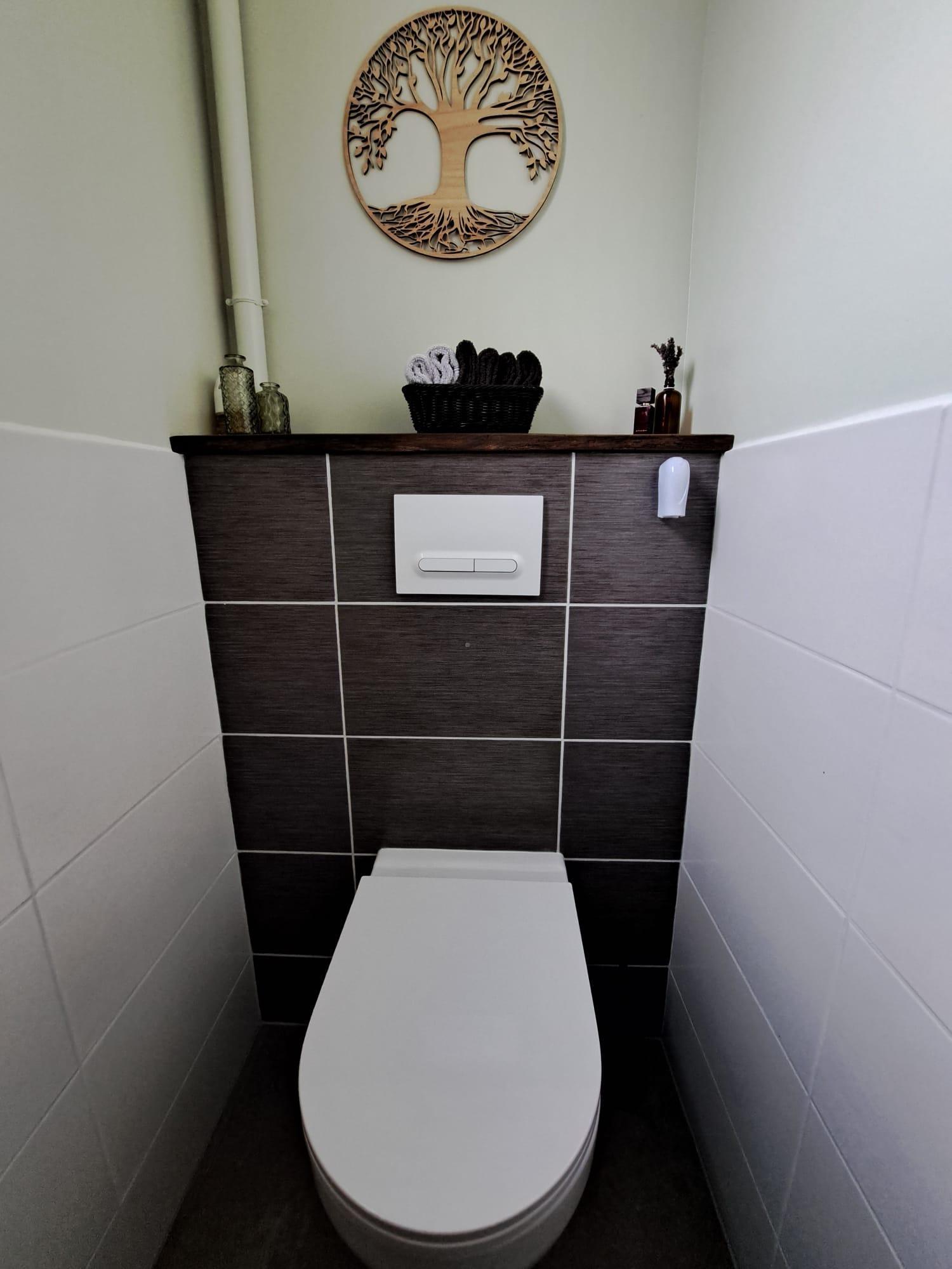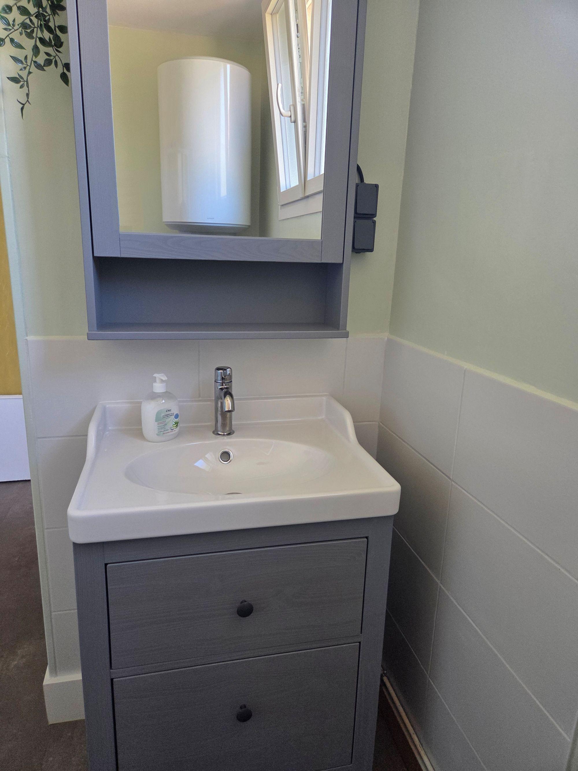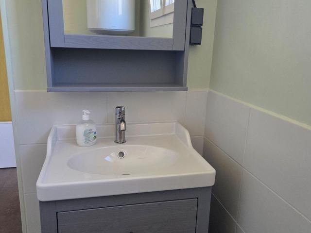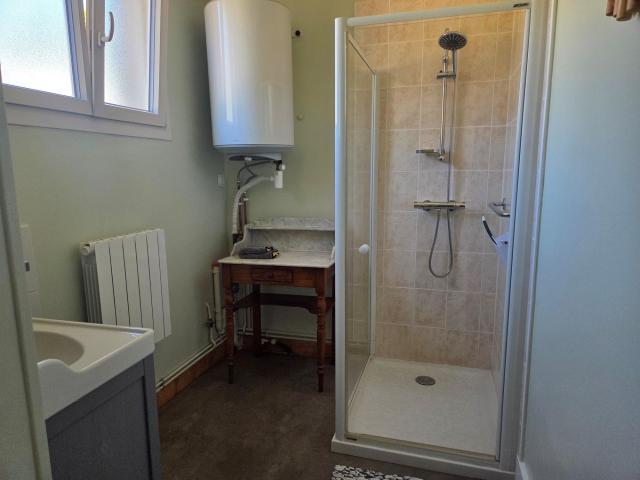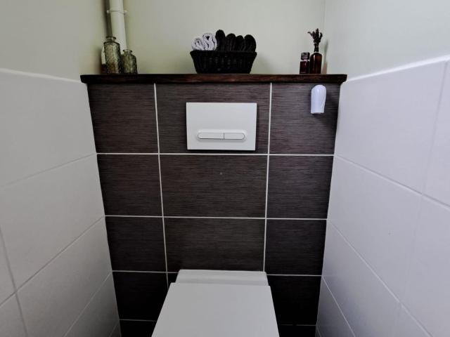 De badkamer is praktisch ingericht met een douche, wastafelmeubel en wasmachine, en wordt verwarmd door een elektrische radiator. Daarnaast is er een apart toilet.