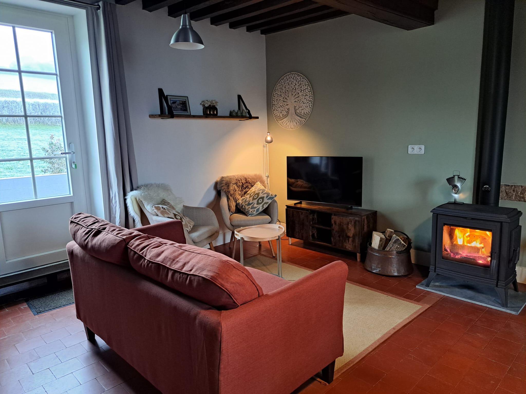De woonkamer is gezellig ingericht met een tweezitsbank, twee comfortabele fauteuils en een eettafel met vier stoelen. De houtkachel zorgt op koelere dagen voor extra warmte en een knusse ambiance.