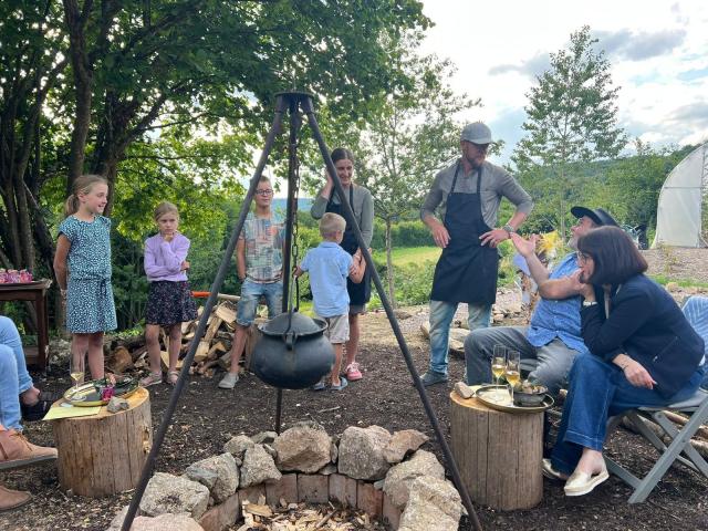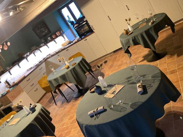 Ondertussen zijn ze al wel gestart met een huiskamerrestaurant: Myrtille (bosbes). Elke vrijdag gaat de grote houten tafel in de woonkeuken aan de kant om plaats te maken voor een restaurantopstelling met keurig gedekte ronde tafeltjes, voorzien van tafellinnen, een mooi servies, gepoetst bestek en gepoleerde glazen. Netjes, maar niet te chic: “We willen kwaliteit bieden in een ongedwongen sfeer. Het is fijn als iedereen zich hier thuis voelt. Onze gasten zien we als onze visite. De kinderen vangen hen op en geven een rondleiding door de moestuin. Wanneer het mooi weer is, serveren we buiten een aperitiefje met vier hapjes. Zodra we echt aan tafel gaan, is het bedtijd voor de kinderen. Het zeven-gangen diner is in de keuken waar tegelijkertijd wordt gekookt. Als het kan, sluiten we daarna buiten bij het kampvuur af met koffie of thee en snoeperijtjes.”