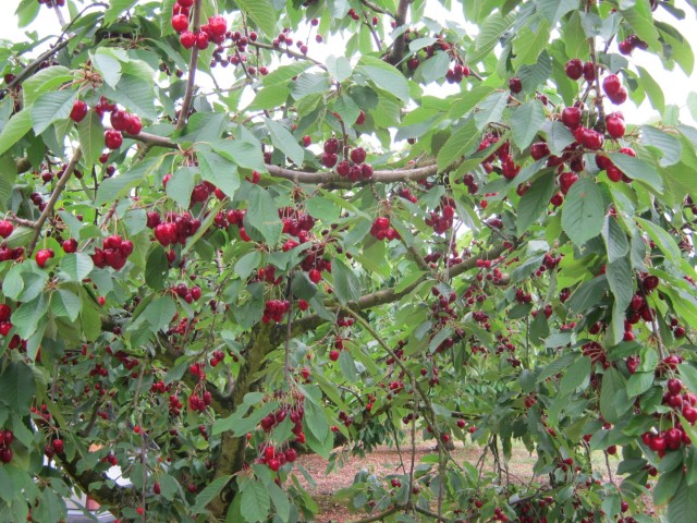 Dit jaar zijn er weer kersen in overvloed. Vorig jaar is een deel van de oogst verloren gegaan door het weer: de regen deed de vruchten zwellen en openbarsten.