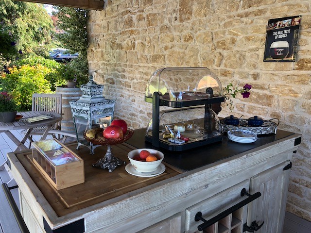 In het huis bevindt zich op de begane grond een sfeervolle entree, 'n ruime woonkamer en 'n eetkamer waar de sfeer van vroeger nog aanwezig is. Het uitgebreide ontbijt van de chambres d'hôtes wordt geserveerd in de eetkamer, of bij mooi weer buiten op het terras of op de veranda. Laat u door ons verwennen met versgebakken brood met allerlei lekkers uit de streek, kaas, fruit, thee, koffie en vers geperst vruchtensap.