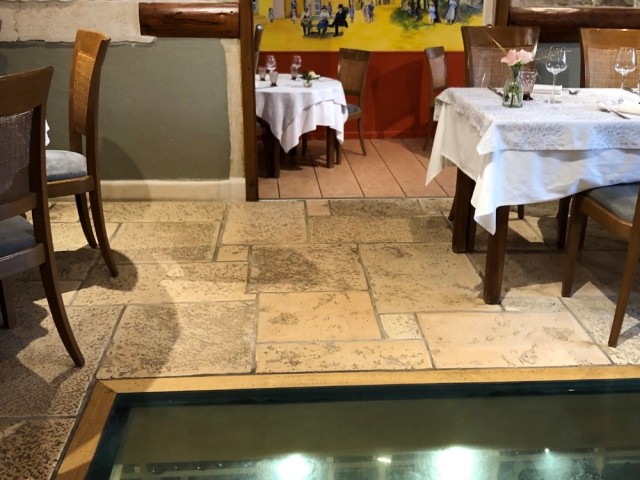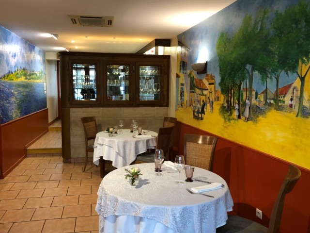 De Auberge is aan de buitenkant makkelijk te herkennen aan z’n zonnige gele kleur. Bij binnenkomst worden de gasten verwelkomd men een groot fresco uit 2005 dat werd geschilderd op basis een oude ansichtkaart van Le Villars. In de eetzaal ernaast kunnen ze door de vloer, die deels van glas is, een blik werpen in de wijnkelder waar circa 2.000 flessen worden bewaard. Allemaal afkomstig uit Frankrijk en de meeste uit de directe omgeving. De selectie van wijnen sluit aan bij de ambitie van de chef-kok om met verse, regionale seizoensproducten te werken.