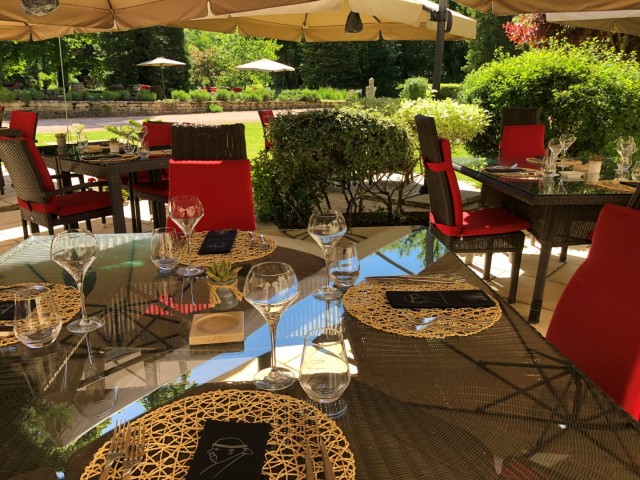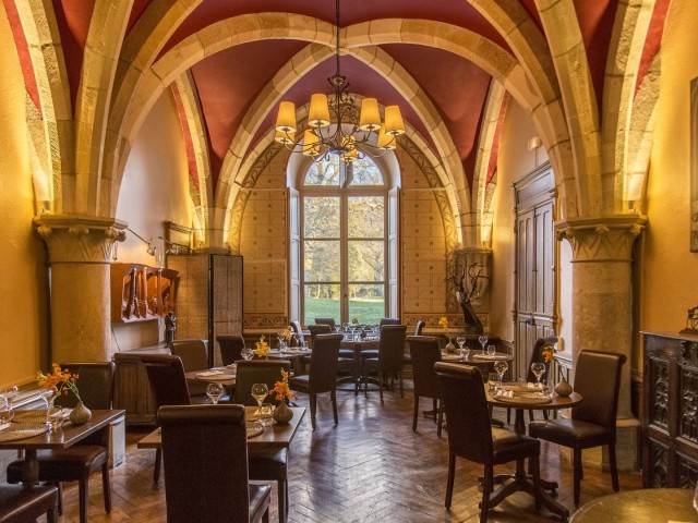 De bistro beschikt over twee zalen. Eén ervan kijkt uit over het mooie park met het meer. De andere zaal was ooit de keuken van de monniken. Bij mooi weer wordt het eten op het terras geserveerd.