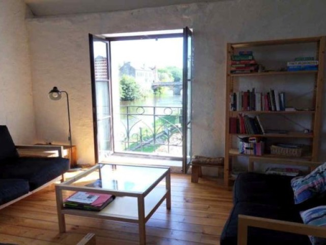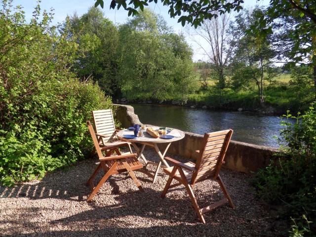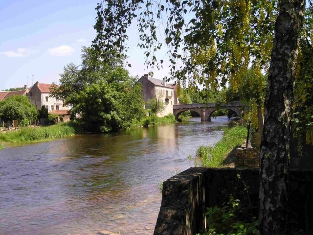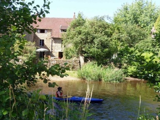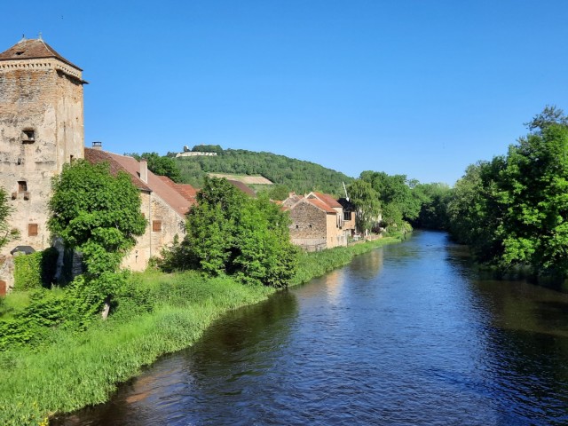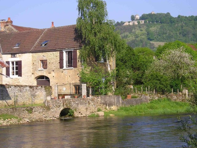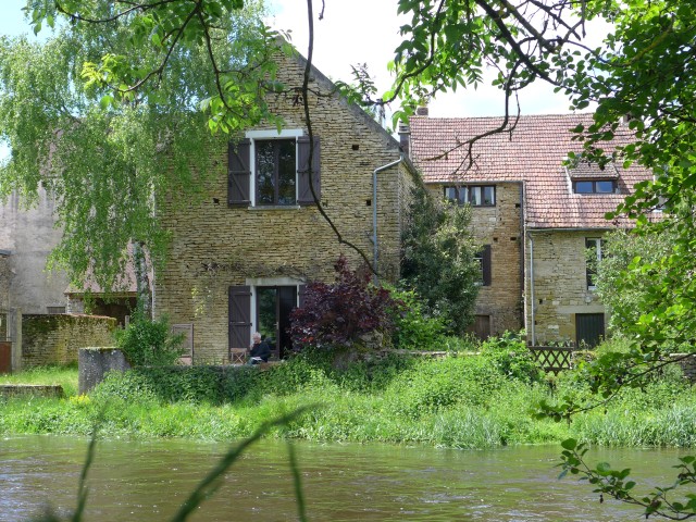 De huizen liggen direct aan de oever van de snelstromende rivier de Cure, met uitzicht op het heuvellandschap aan de overkant.
