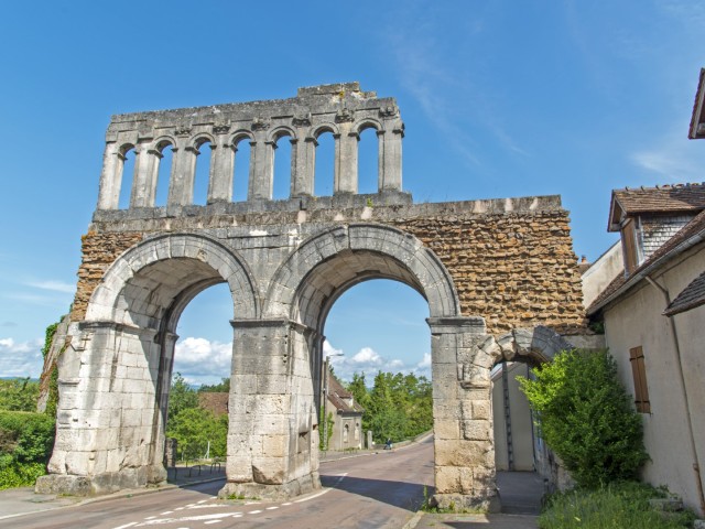 De Porte d’Arroux poort aan de noordzijde van de stad is het beste bewaard gebleven. Aan weerszijden van de hoofdingang, waar de voertuigen doorheen gingen, was een kleinere poort voor de voetgangers gemaakt. Vanwege tolheffing waren er dubbele poortdeuren. Van de Porte Saint-André, aan de oostzijde van de stad, staat één van de torens nog overeind. Die is in de Middeleeuwen in gebruik genomen als kerkje.