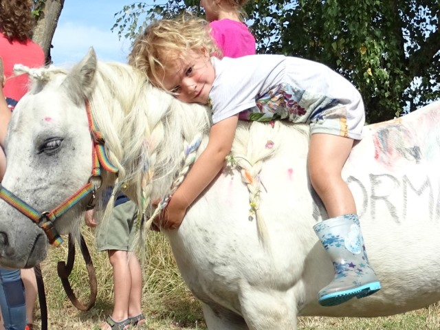 Verder lopen er 2 hele lieve paardjes rond die de kids mogen borstelen en knuffelen en waar we ook een stukje mee gaan rijden over de camping.