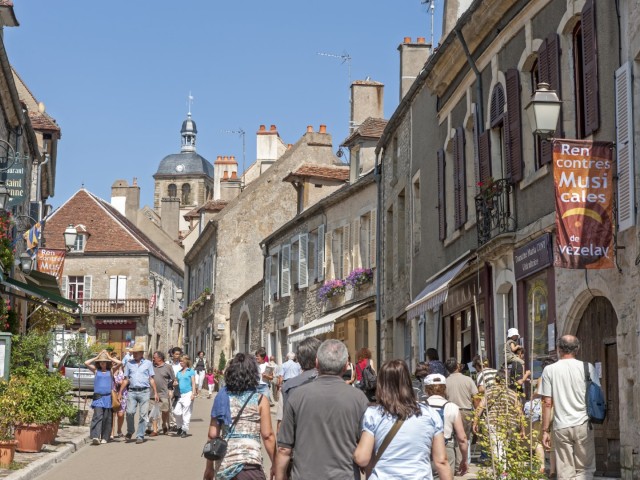 De heuvel waarop Vézelay en de basiliek zijn gebouwd is al van veraf zichtbaar: hij domineert de Vallei van de Cure en de wijngaarden van de Vézelien. Wie het middeleeuwse dorp wil verkennen, moet de auto achterlaten aan de voet van de Mont-Scorpion die vooral bekend is als de “colline éternelle” (eeuwige heuvel). Het is even klimmen om via de hoofdstraat, langs prachtige gevels, kleine winkeltjes en kunstgalerieën, de op de top komen.