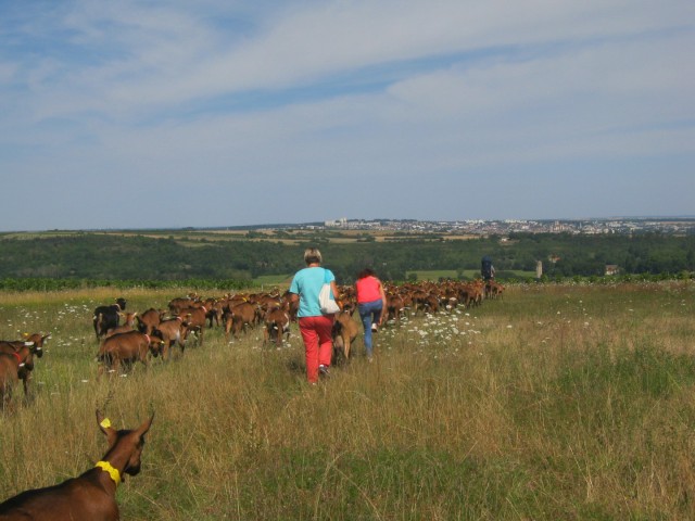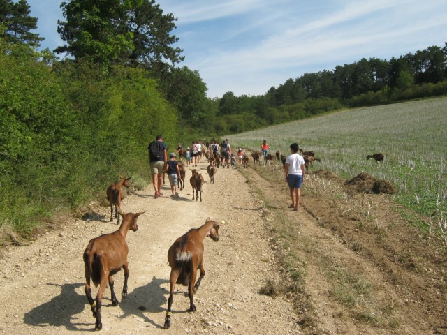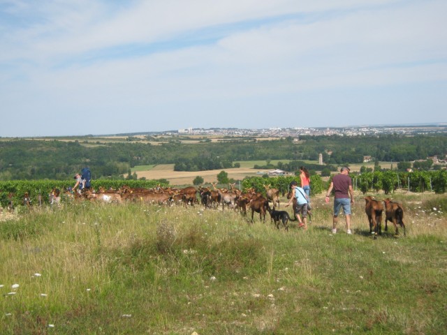 De route van enkele kilometers voert langs de wijngaarden van Saint-Bris-le-Vineux, naar de top van een heuvel met uitzicht over de stad Auxerre. De enthousiaste geitjes stuiven onderweg iedereen voorbij, maar stoppen voortdurend om te smullen van de struiken. Hier en daar stelen ze ook wat blaadjes van de wijnranken, hoewel hond Rocky z’n best doet om dat te voorkomen.