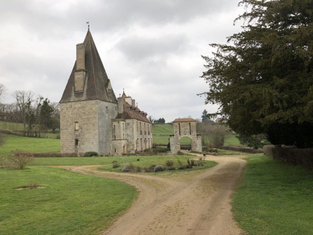 - Neem bij het kruis de weg naar links (het kasteel is dan rechtsaf), en op de kruising de weg naar rechts. U ziet dan rechts het imposante poortgebouw van het kasteel van Morlet.