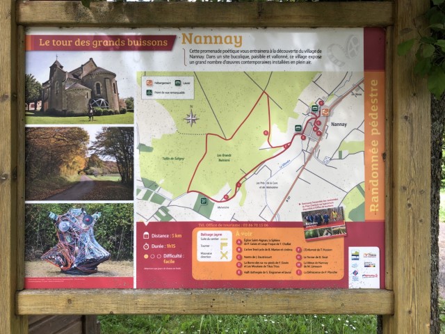 - Neem links de asfaltweg omlaag naar het dorp (wie de asfaltweg verder omhoog loopt, ontdekt nog enkele kunstwerken, waaronder Un cactus pour Nannay en Obscura Redeviva en komt uiteindelijk bij de wijngaarden van de Côtes de la Charité). Op de terugweg naar het dorp kunt genieten van een mooi uitzicht over de omgeving. Na een stukje lopen, ziet u La Vénus de Nannay. Het kunstwerk verderop heet La Déhiscence. Het is een ideale plek voor een pauze.