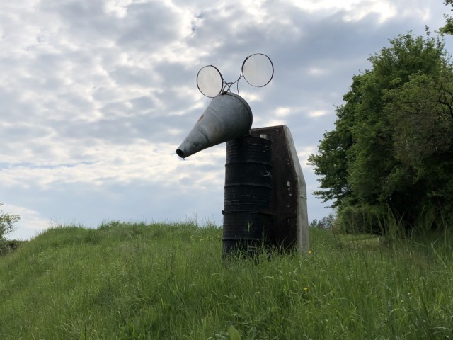 - Loop een stukje terug en pak de Rue des Lavoirs tot aan de tweede wasplaats. Ga daar rechts omhoog de Rue Belle Catherine in. Na 150 meter komt u bij l’Enfumoir van Thierry Husson. Volg daar rechts het pad omhoog naar het bos. Na de bocht ziet u Le Terrier de Taille humaine van Benoït Sicat. Bij de grotere kruising het pad naar links nemen.
