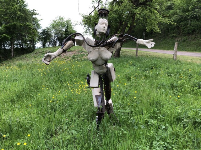 - Voor de kerk ziet u al de eerste werken: Loup-Foque van Thierry Collat en (tegen de kerk) La Sphère van Pierre Gallais. Op het plein bij het gemeentehuis staat links de boom Tree’Cycle Métallique van Bruno Marion die uitnodigt om onze hedendaagse wijze van consumeren te heroverwegen.
